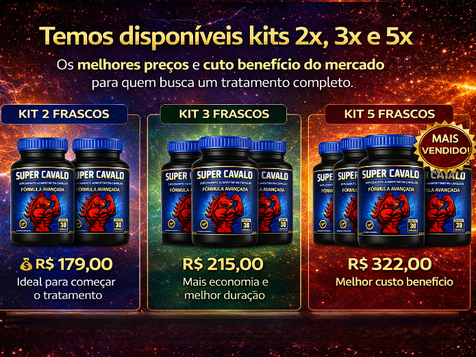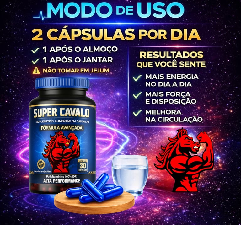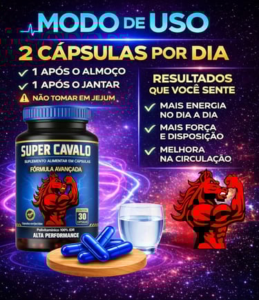 O Super Cavalo é um suplemento natural desenvolvido para homens que buscam mais energia, disposição e desempenho no dia a dia. Sua fórmula combina ingredientes selecionados para auxiliar na vitalidade, resistência física e foco mental.